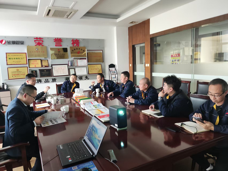 考察伊始,万家乐专家组首先在金潮新材会议室进行了资料审核环节。专家组本着严谨细致的态度,对公司营业资质、程序文件、客户满意度调查记录及售后问题处理流程等资料进行了全面细致的核查,重点关注了企业质量管理体系的运行情况。作为拥有ISO9000、ISO14000等多项管理体系认证的高新技术企业,金潮新材完备的资料体系得到了考察组的认可。